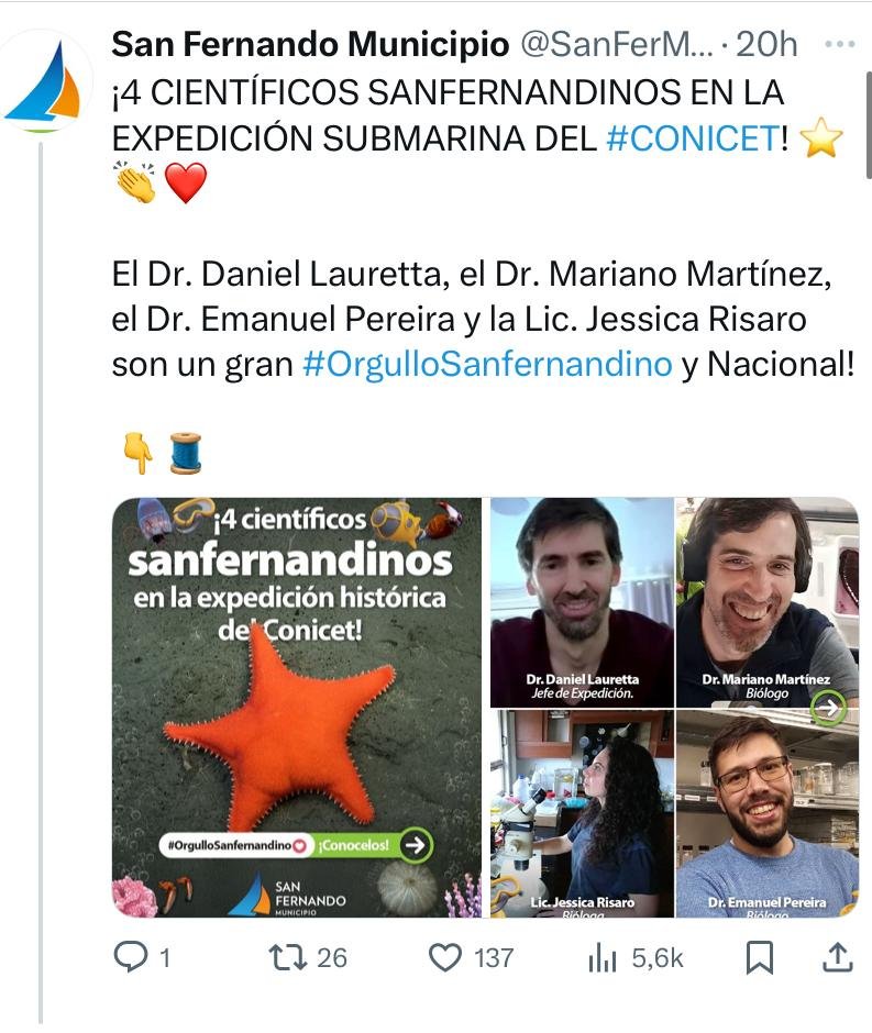 El municipio de San Fernando destacó a través de las redes sociales la participación de cuatro ciudadanos de su distrito en la expedición submarina del cañón submarino Mar del Plata, cuya transmisión en vivo a través de ‘streaming’ se hizo viral a fines de julio y principios de agosto.