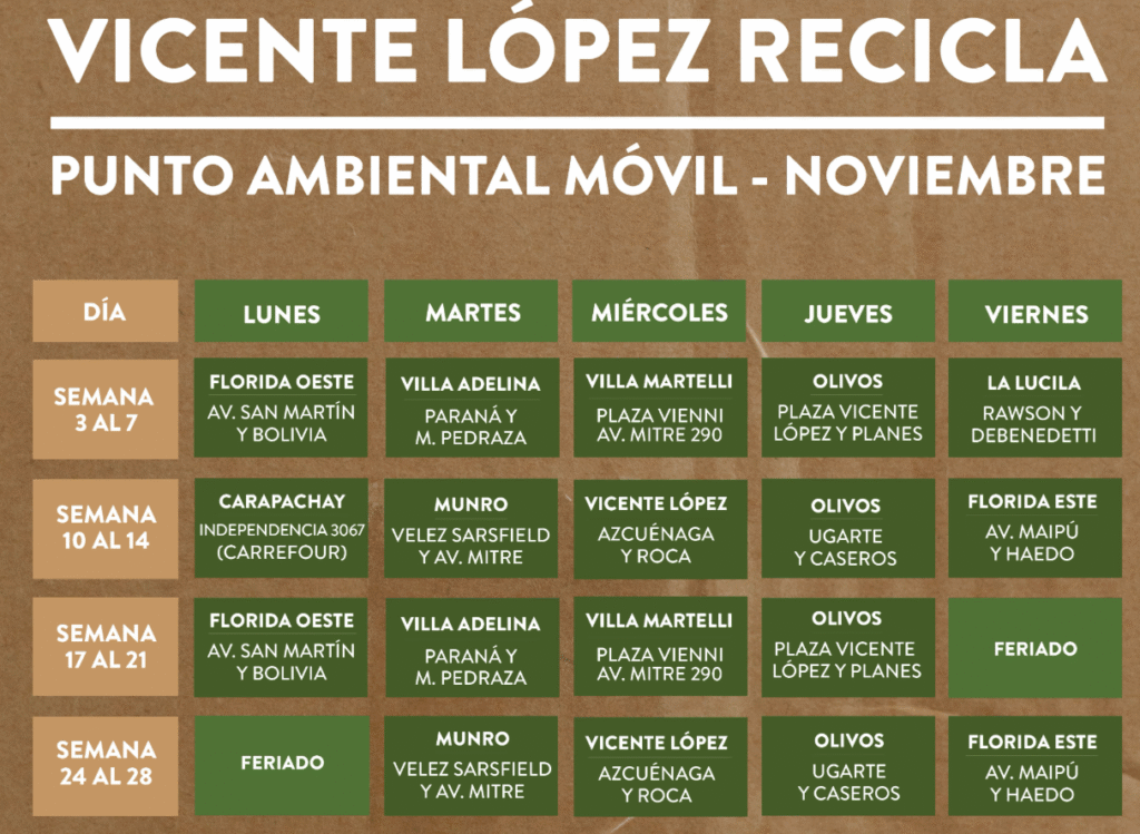 Por segundo año consecutivo, el programa funciona en todo el partido de Vicente López, en el norte del conurbano bonaerense. Con un cronograma rotativo que cada mes es comunicado oficialmente, el Punto Ambiental Móvil ofrece a los vecinos la posibilidad de acercar sus descartes diferenciados a un sitio específico de cada localidad.